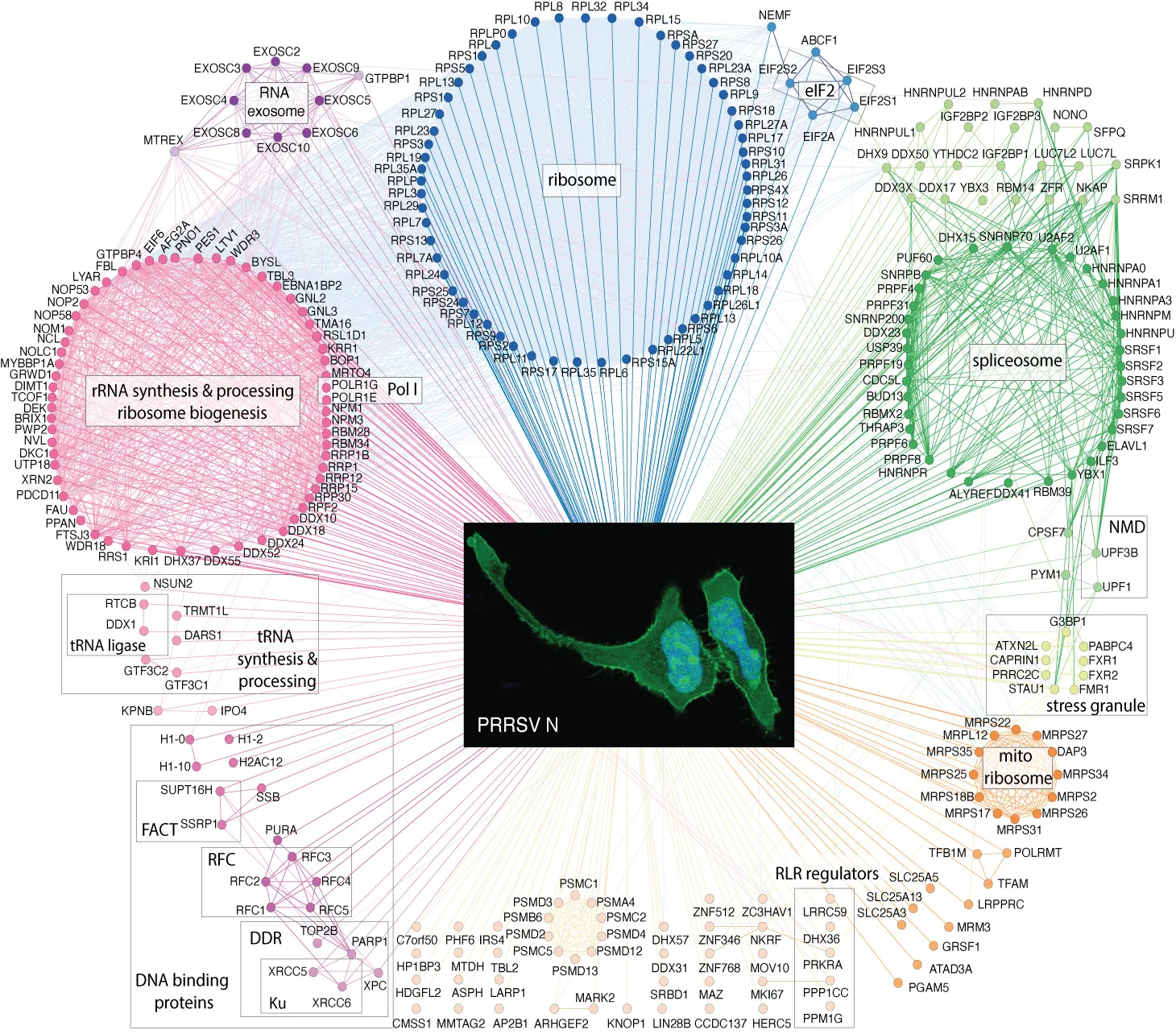 Porcine reproductive and respiratory syndrome virus (PRRSV) remains a major threat to the swine industry worldwide. Our lab applied advanced proteomics to explore host proteins interacting with the viral nucleocapsid (N) protein, revealing how this key viral component engages cellular machinery. Notably, we discovered a previously unrecognized pool of N protein on the cell surface, suggesting new functional roles beyond its canonical nuclear and cytoplasmic localization. Building on this, we are now characterizing the host cytosolic proteins that associate with N at the cell surface, aiming to uncover novel mechanisms of viral manipulation and potential intervention points. This work highlights the richness and complexity of virus-host interactions and illustrates our lab’s commitment to revealing hidden layers of cellular networks through integrative proteomic approaches.